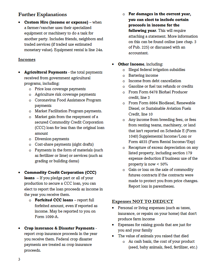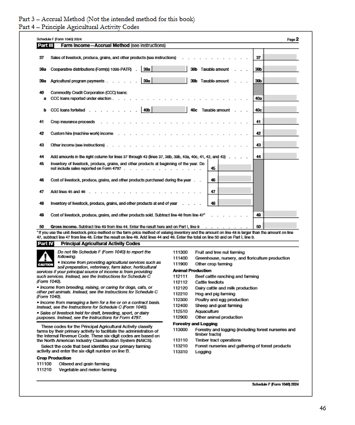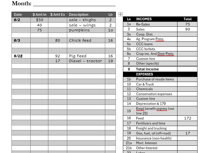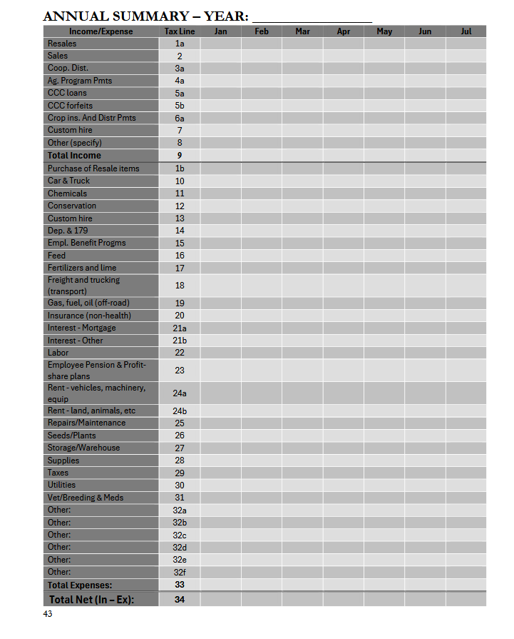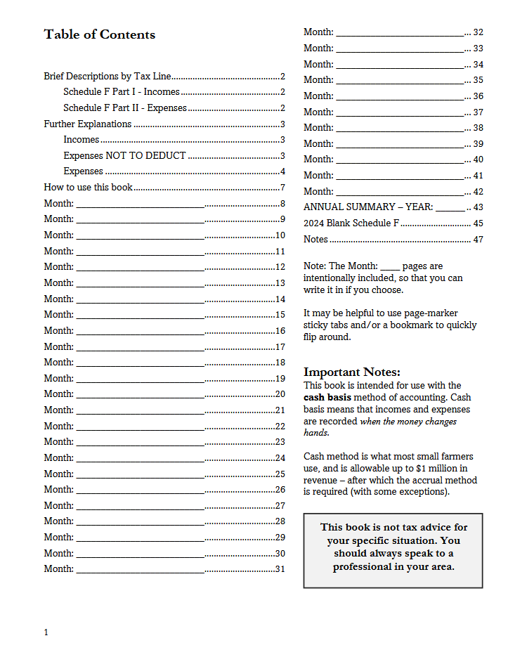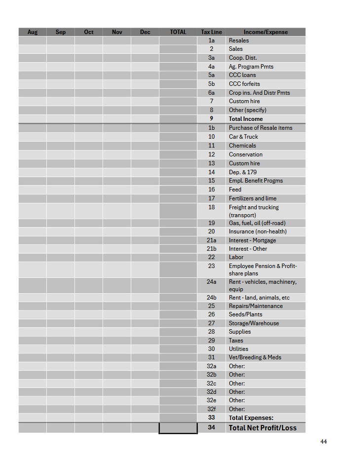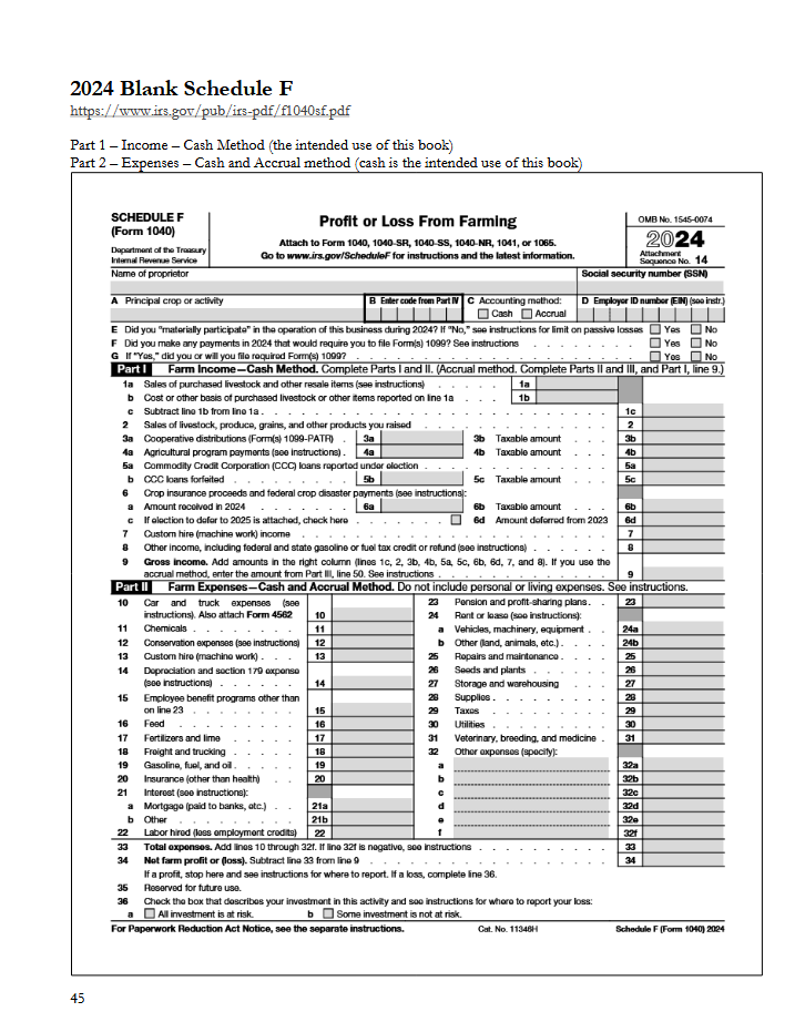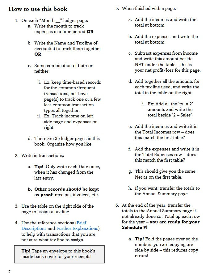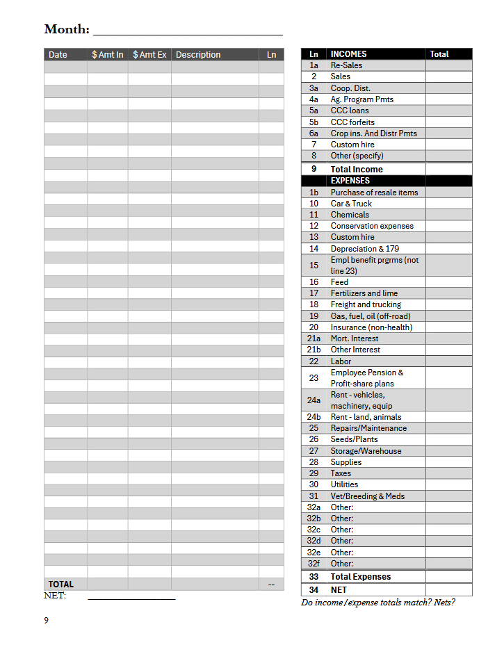 Use this ledger to record income and expenses according to Schedule F tax lines. Designed for small farmers using the cash basis method.