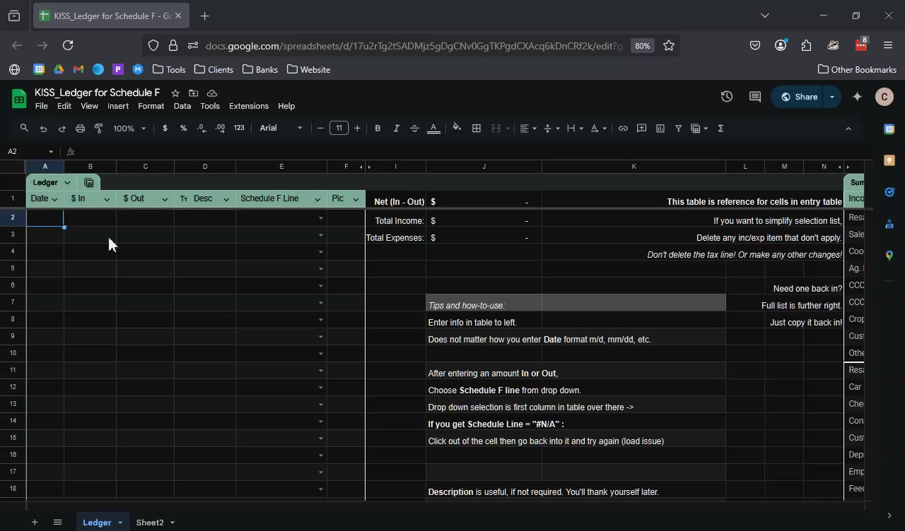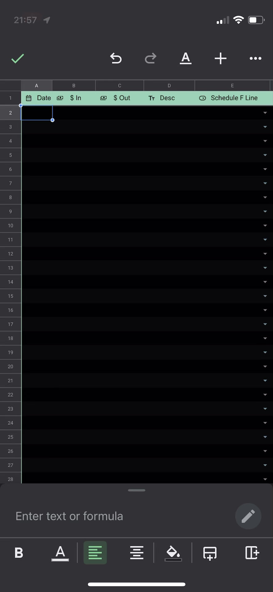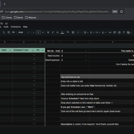This KISS (Keep It Simple Stupid) spreadsheet is designed to be as easy possible to use. After you enter money in the IN or OUT column, you can select a Schedule F tax line from a drop down. Your Schedule F is built for you on the right. Designed with desktop or mobile in mind.